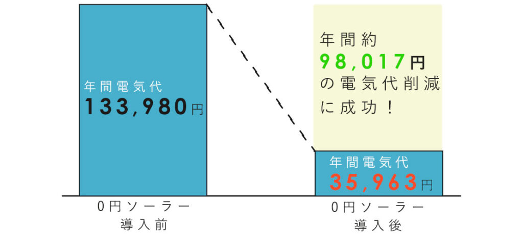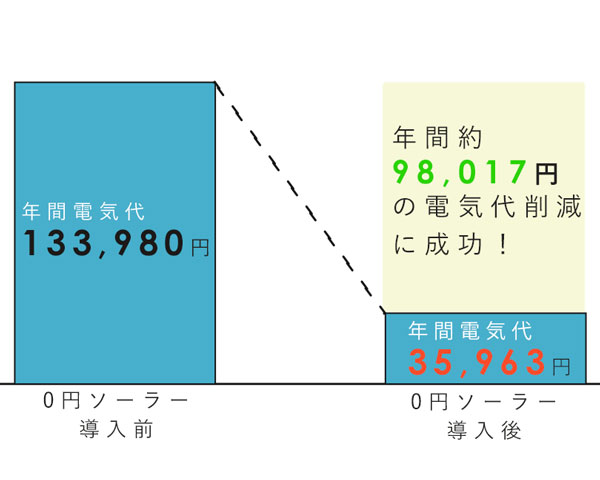 あるご家庭では年間電気代133,980円でしたが、0円ソーラーを導入したところ35,963円まで抑えることに成功しました。