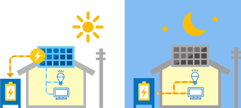 太陽光の出る昼間に自家発電して、昼間中に使い切れなかった分の電気は蓄電池に貯まります。