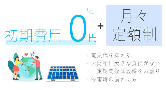 0円ソーラーは初期費用0円+月々定額制で始められる、太陽光発電システムです。一度に大きな負担を負う必要がないので、気軽に始めていただけます。